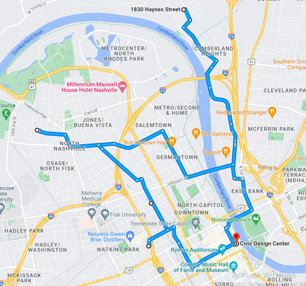 This depicts the proposed route starting and ending at the Civic Design Center office