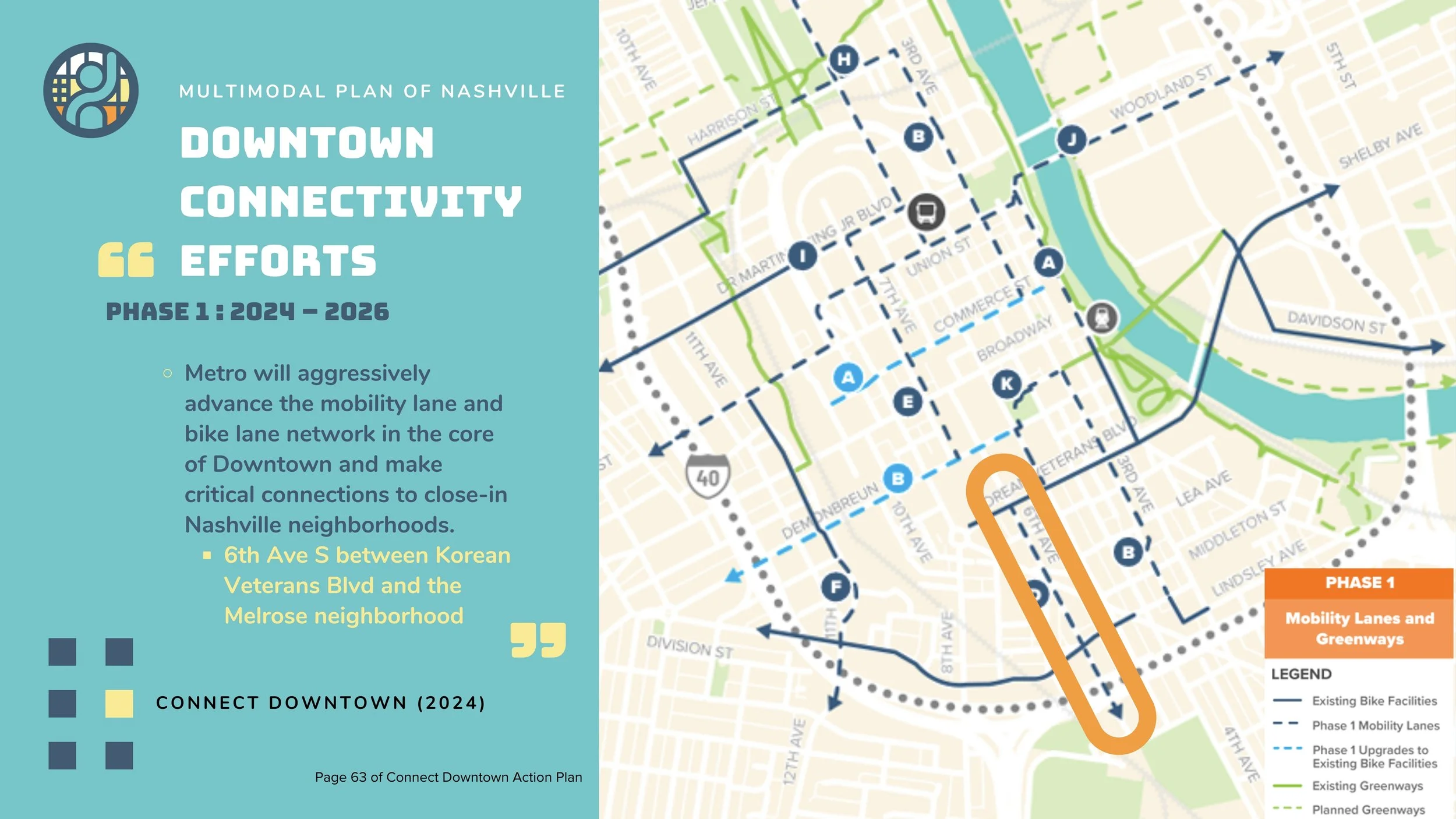 The Nashville Department of Transportation’s Connect Downtown initiative has focused on improving mobility through the downtown core. Within that effort, 6th Avenue has been identified as a key corridor for micromobility and neighborhood connections.