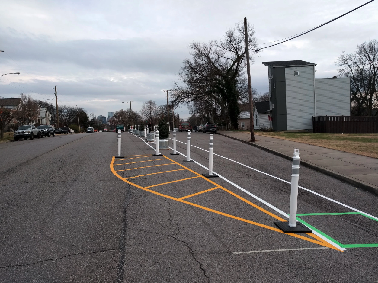 The designs demonstrated by the tactical urbanism installation in 2017 were altered and implemented to accommodate the parking for the shown in the image above.