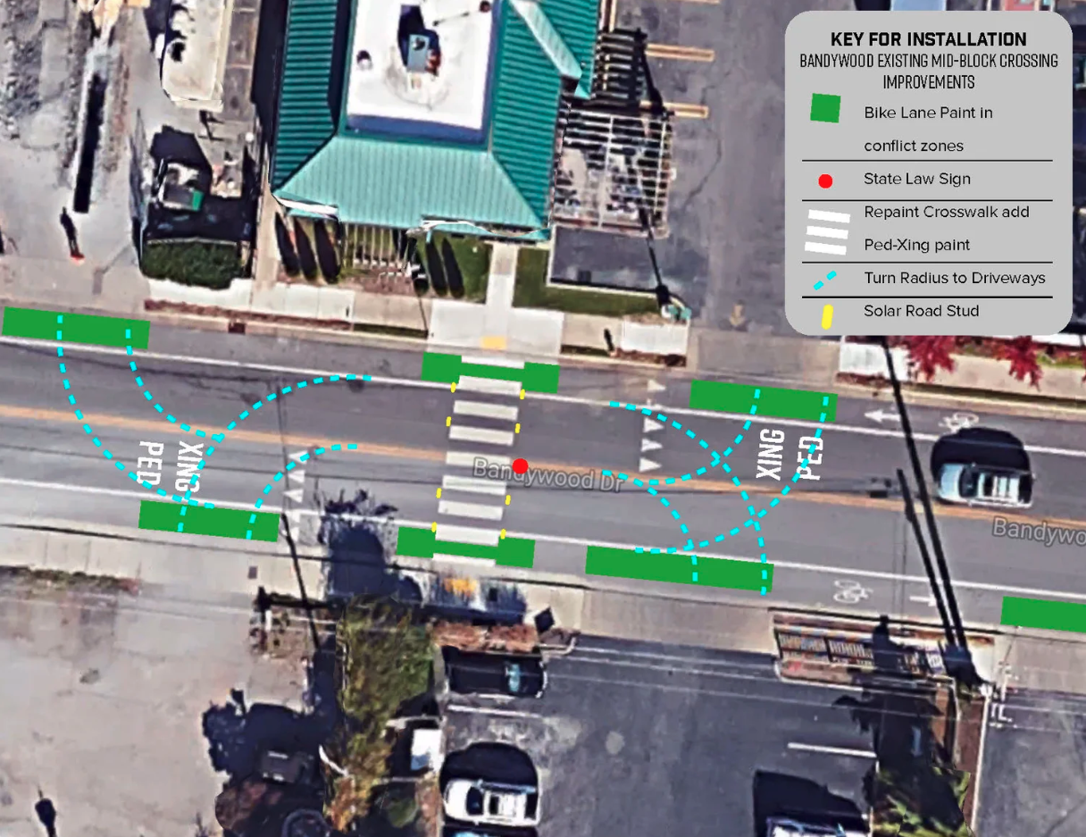 The only pedestrian connection between two major retail centers, the mid-block crosswalk along Bandywood Drive was identified as an area of needed improvement to better support pedestrian access and safety.