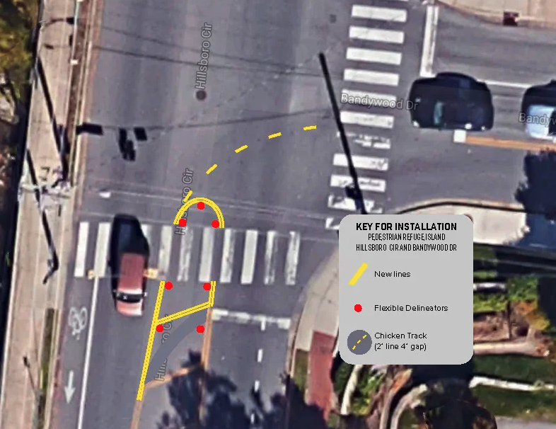 The long-term installation is located within the existing crosswalk at the intersection of Hillsboro Circle and Bandywood Drive. The goal of the improvement was to increase safe access for pedestrians, particularly those of the Green Hills Apartment, to nearby retail and grocery. This was done by creating a pedestrian refuge between the travel lanes along Hillsboro Circle, and implementing a guided turn lane for drivers entering to/from Bandywood Dr.