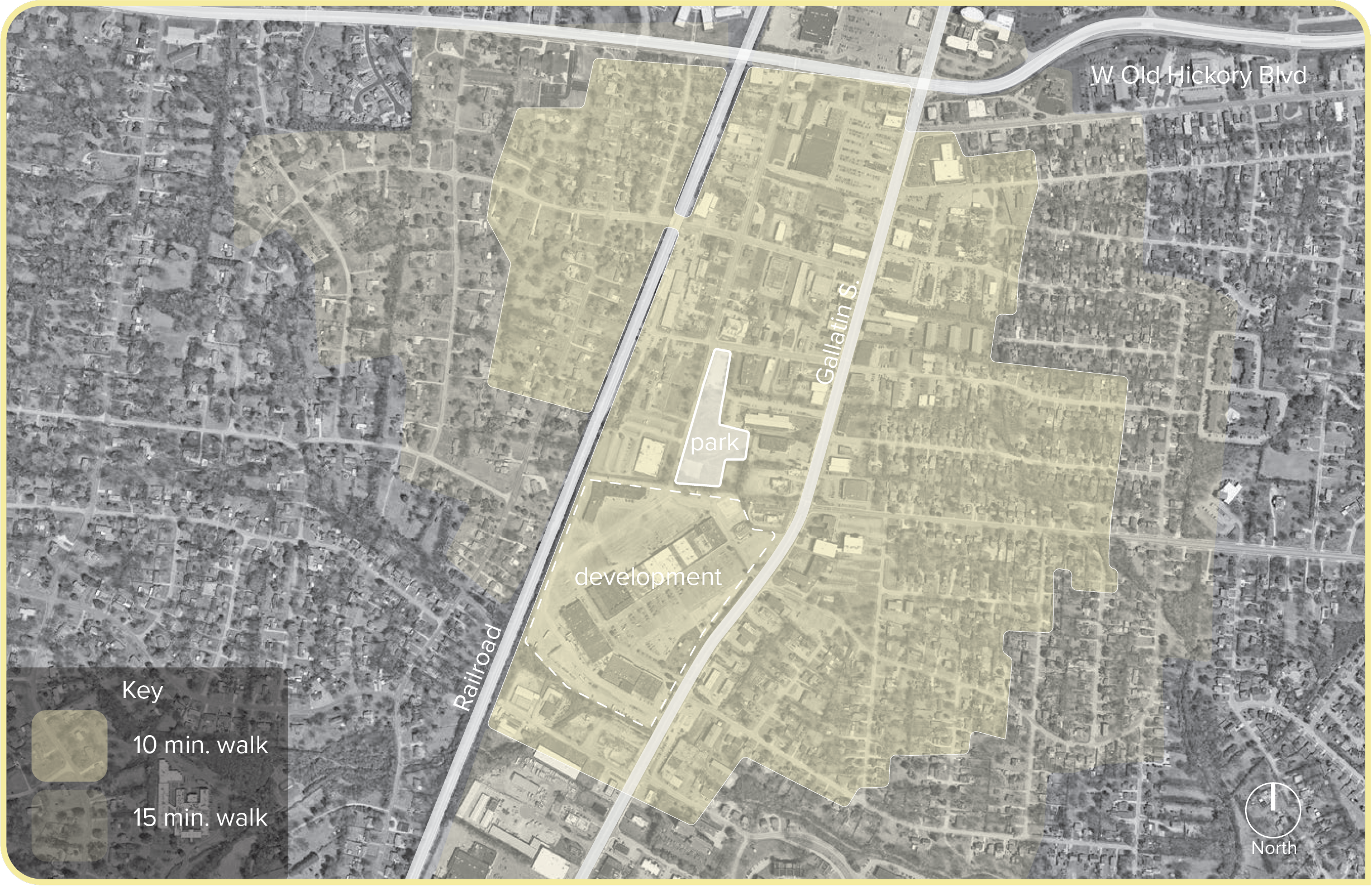 Map depicting walkability of area surrounding the park, otherwise known as walk shed