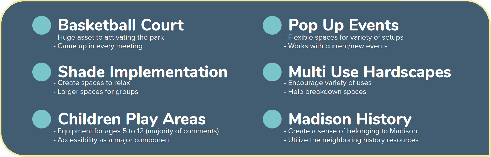 The following were secondary major components that participants mentioned in their responses about the future Park’s design. Specifically, we identified that a basketball court, pop-up events, shaded areas, multi-use hardscapes, and areas for children to play accessibly are important features for surveyed community members. Additionally, they are interested in showcasing the history of the Madison neighborhood in some way.