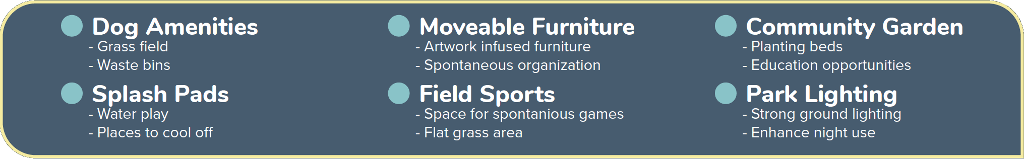 The following percentage of total people surveyed identified these themes as major components to the future Park’s design. We have identified Art, Safety. Fitness, and Plants as the categories with the most desired characteristics.
