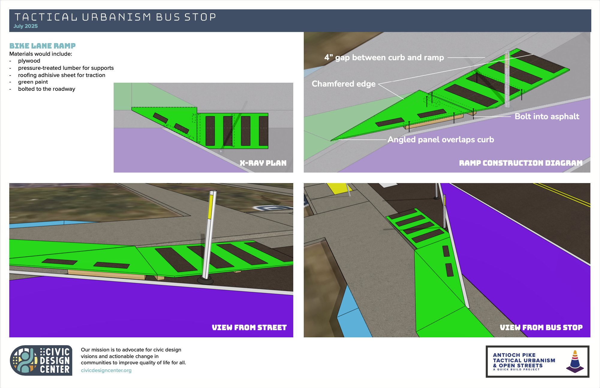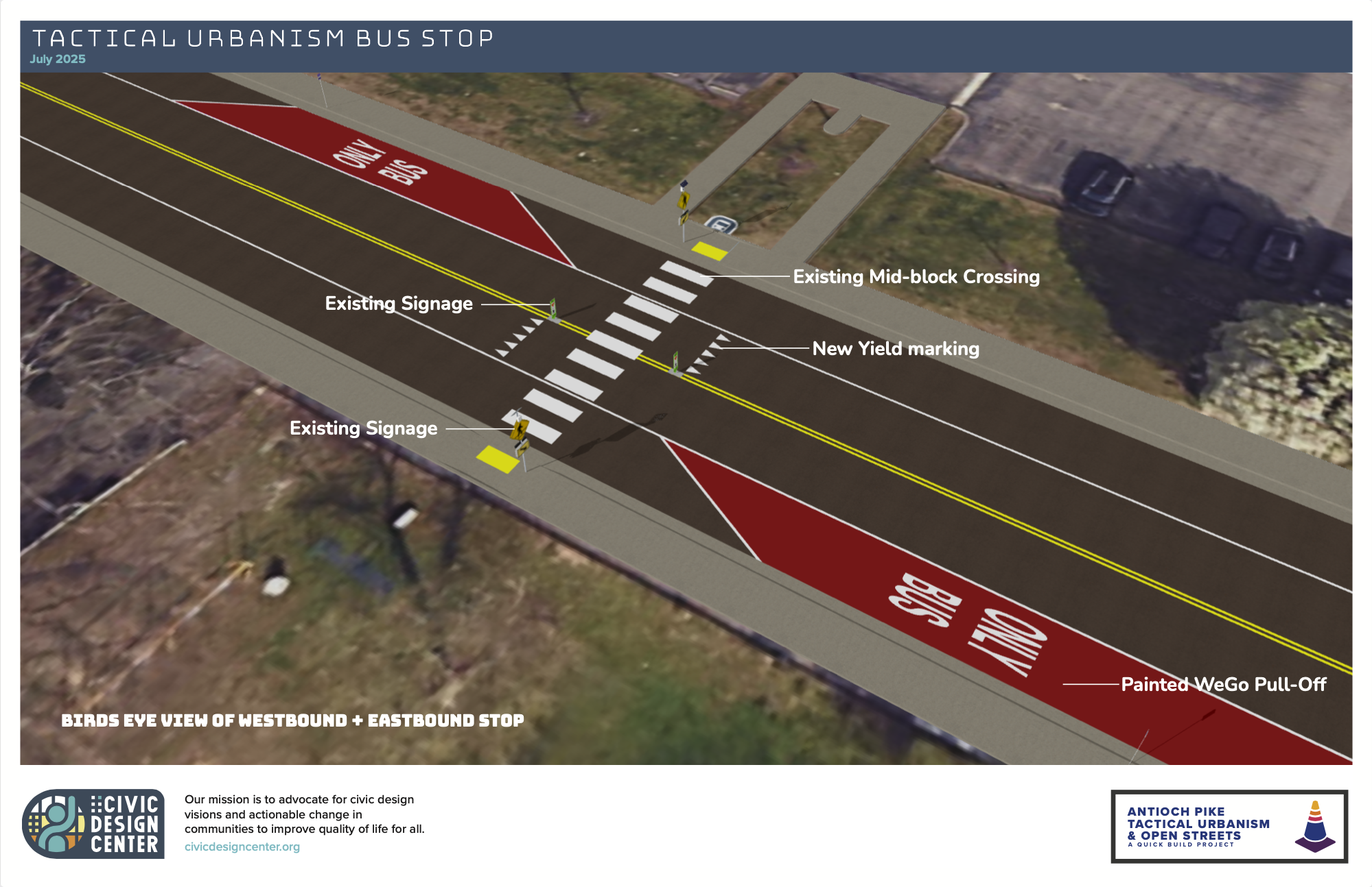 The Civic Design Center is proud to work alongside NDOT, the Tennessee Department of Health, the Bridgestone Foundation, Walk Bike Nashville, and local residents to show what’s possible when we rethink our streets. The temporary bus stop is just one example of how tactical urbanism can improve everyday life—making Antioch Pike safer, more connected, and more welcoming for everyone.