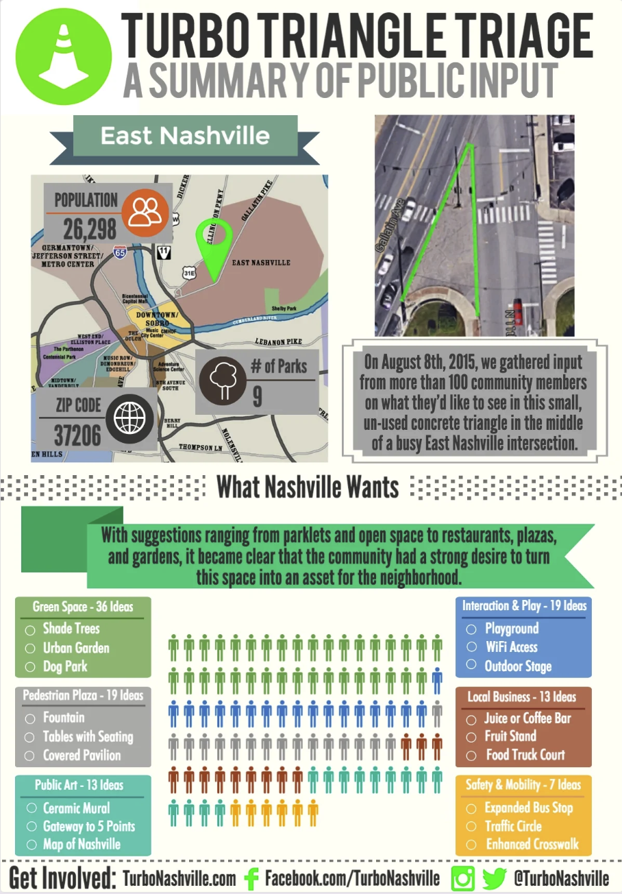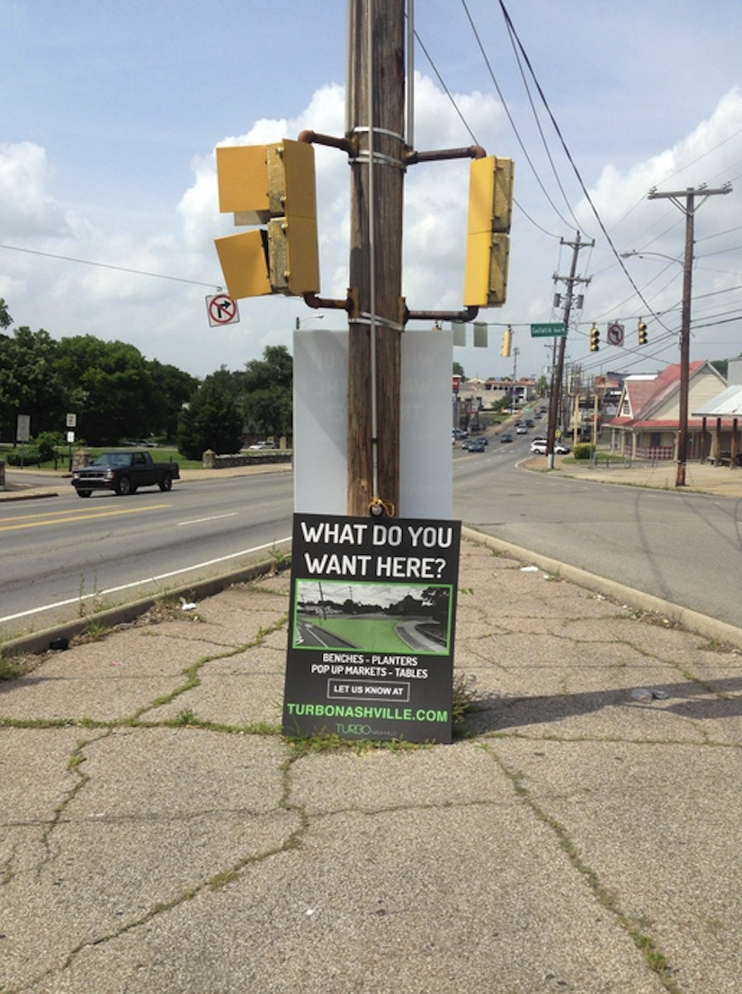At the 2015 Tomato Festival, a group of Tactical URBanism Organizers (aka TURBO Nashville) vowed to reclaim public space in a desolate asphalt traffic triangle at the intersection of Gallatin Pike and 11th Avenue in East Nashville. The goal was to convert dangerous and unpleasant pedestrian space into an enjoyable, safe place that promotes walks to Five Points.