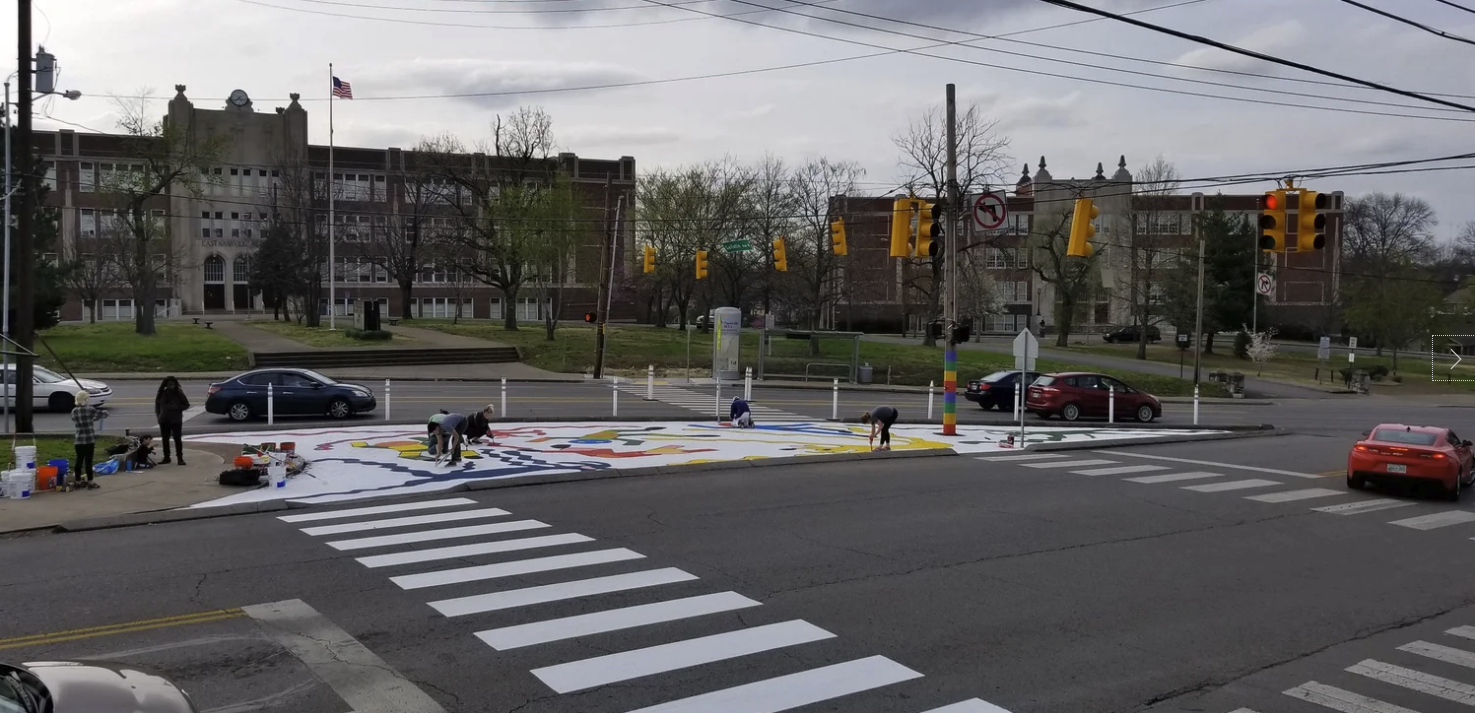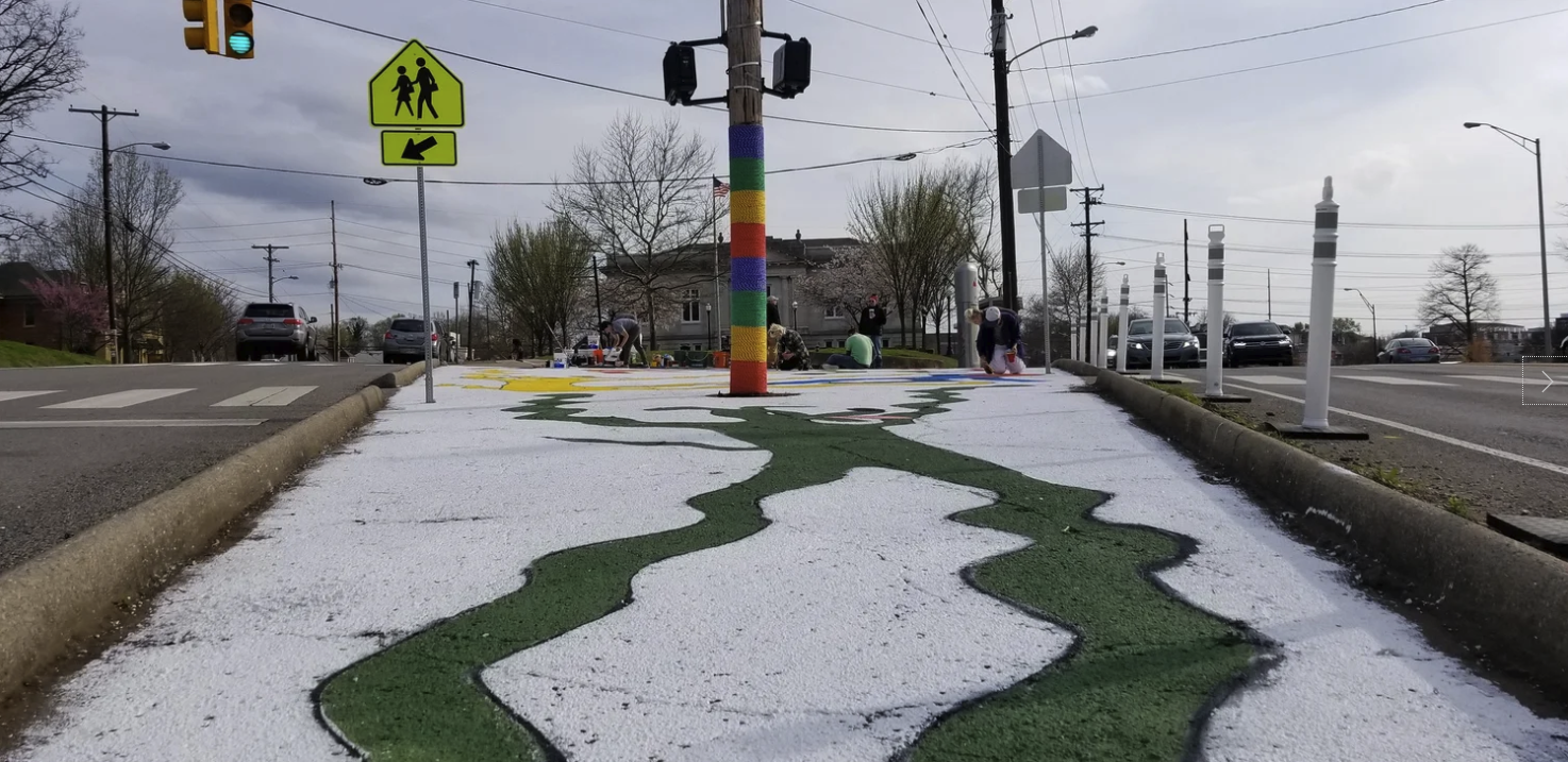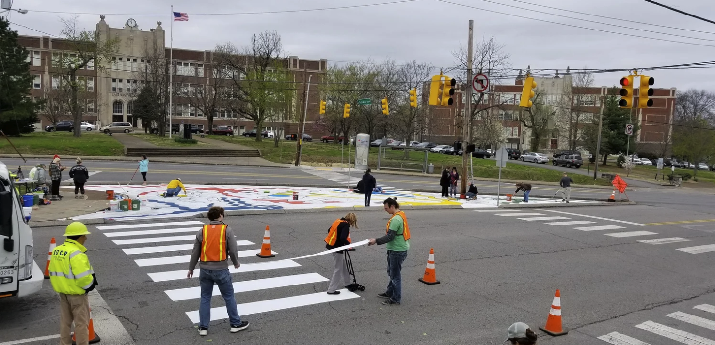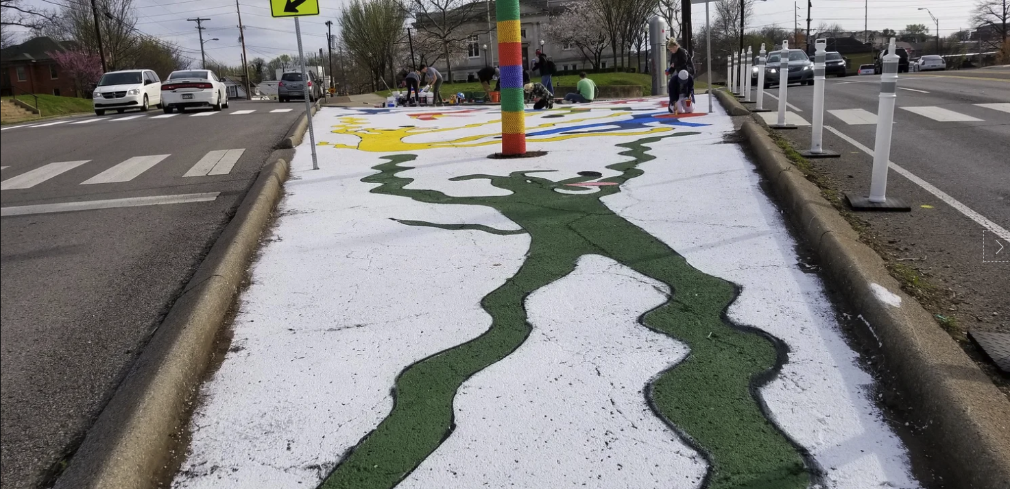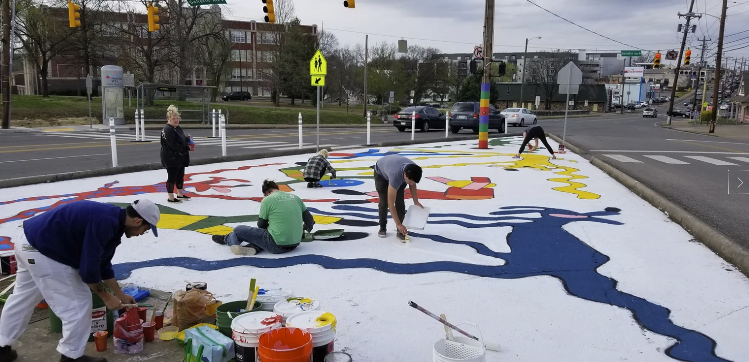 Preparing for the Complete Streets Conference, NCDC's TURBO Nashville, Ellie Caudill (Muralist) and volunteers from the Greater Nashville REALTORS® installed a temporary plaza, crosswalk, and mural. This project highlights an ongoing conversation in Nashville regarding the need for increased safety, public art, and public participation throughout Nashville.