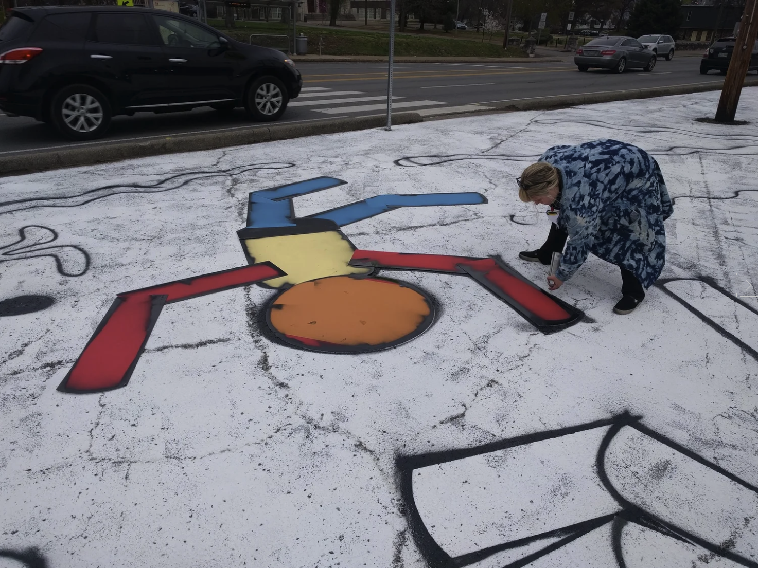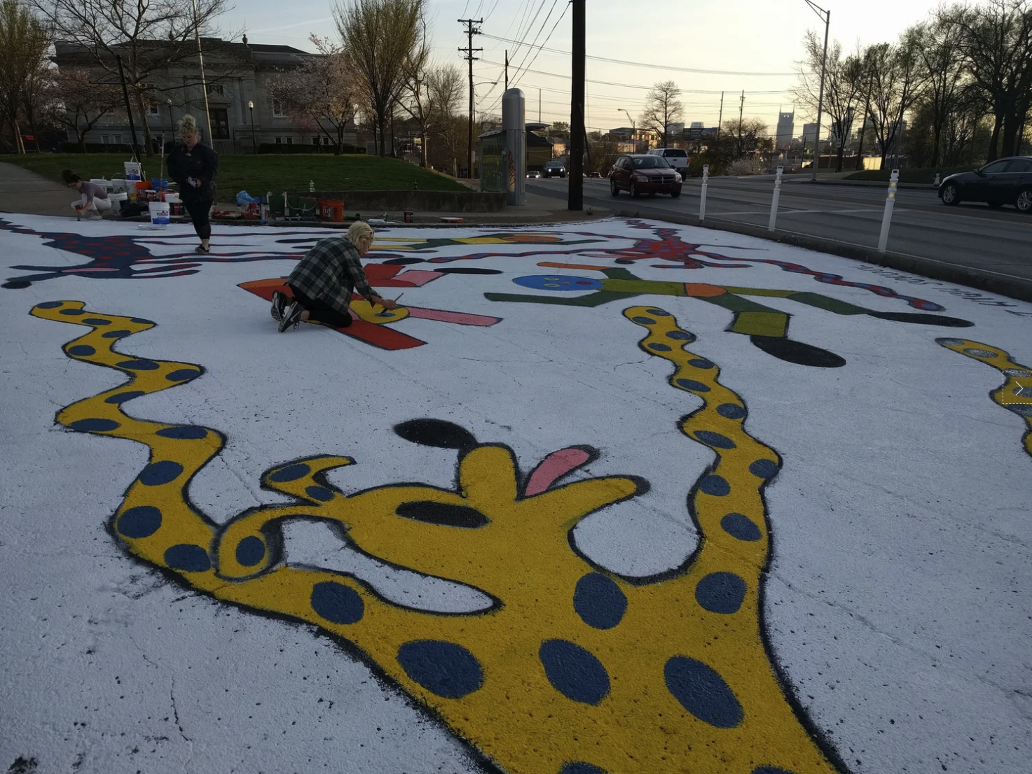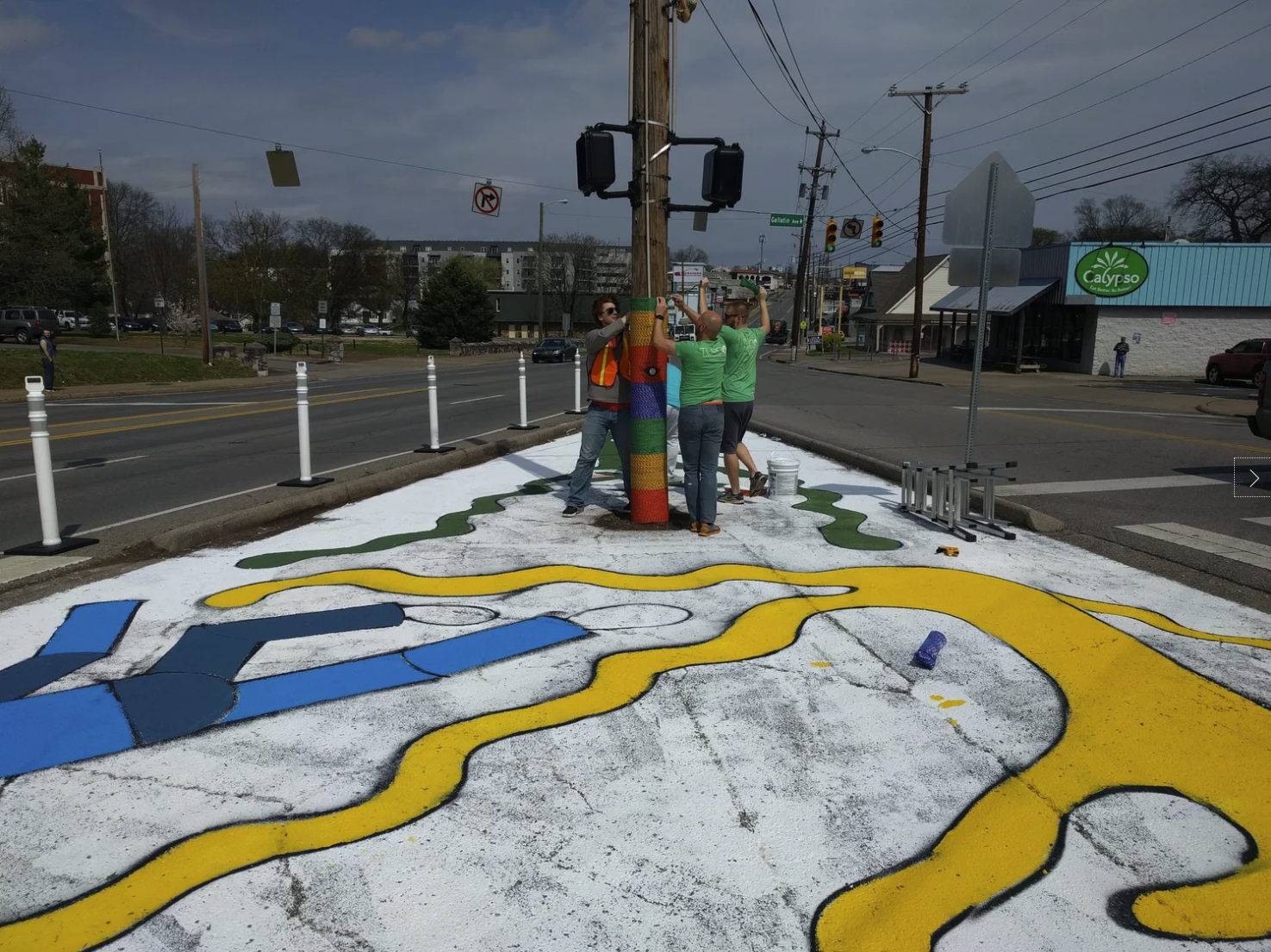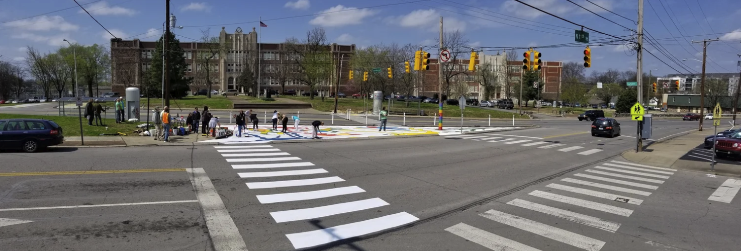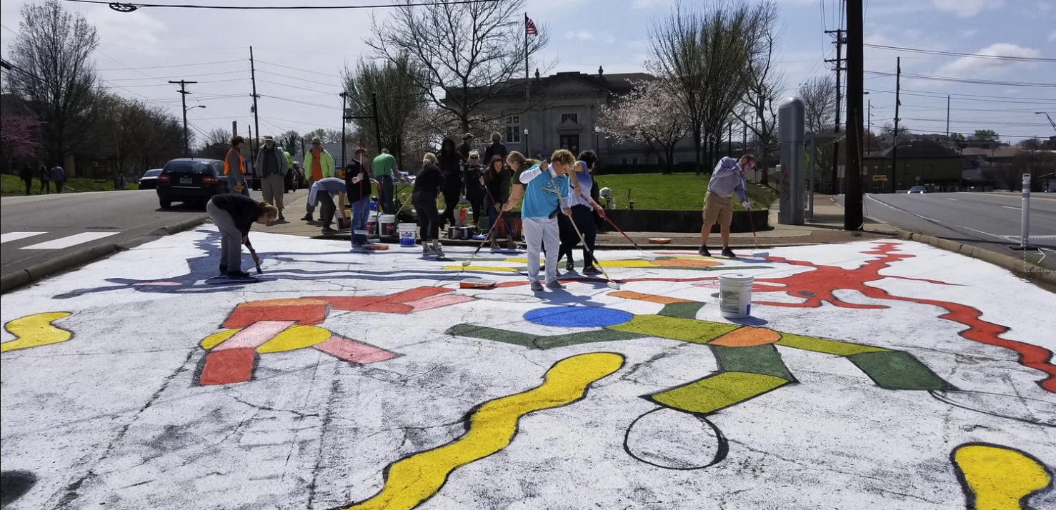 Preparing for the Complete Streets Conference, NCDC's TURBO Nashville, Ellie Caudill (Muralist) and volunteers from the Greater Nashville REALTORS® installed a temporary plaza, crosswalk, and mural. This project highlights an ongoing conversation in Nashville regarding the need for increased safety, public art, and public participation throughout Nashville.