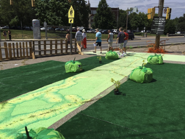 The impetus behind creating this guarded, more pleasurable area during Tomato Fest was the greater volume of people walking to the festival. This installation would draw attention to the area and begin a conversation about permanent change to this egregious pedestrian space.